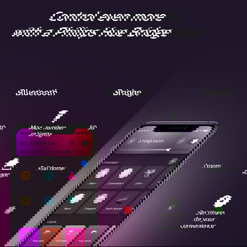 Do more with a Hue Bridge. Add a Hue Bridge to your Bluetooth-controlled setup to make your smart lighting system even smarter.* Add up to 50 lights and smart accessories throughout your home, and unlock upgraded features like away-from-home control. *Hue Hub (B016H0QZ7I) sold separately